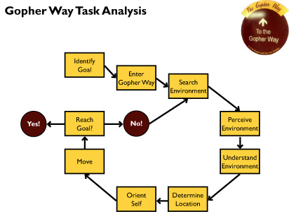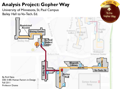 Human factors and usability task analysis of the Gopher Way, the University of Minnesota’s system of tunnels and skyways. User observations, walk-throughs, gaze plots, and heat maps of key areas were used to discover visual, cognitive, decision making, and environmental human factors concerns. Finally, this data was used to create a task map and task domain model of the task of using the Gopher Way.