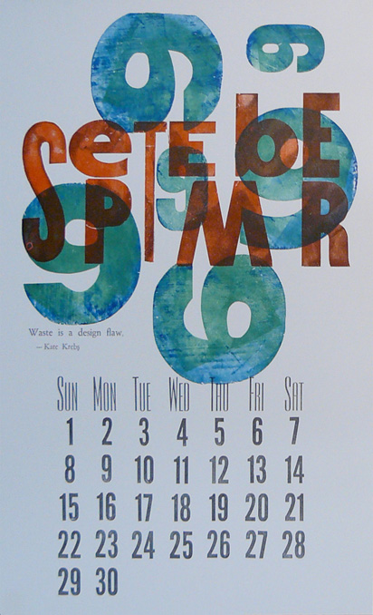 For this calendar page, contrasting colors were used to portray the coolness and warmth of a Minnesotan September. While darker shades of blue emphasis the texture of the woodtype. Finally, metal type is used for the calendar days and design quote.